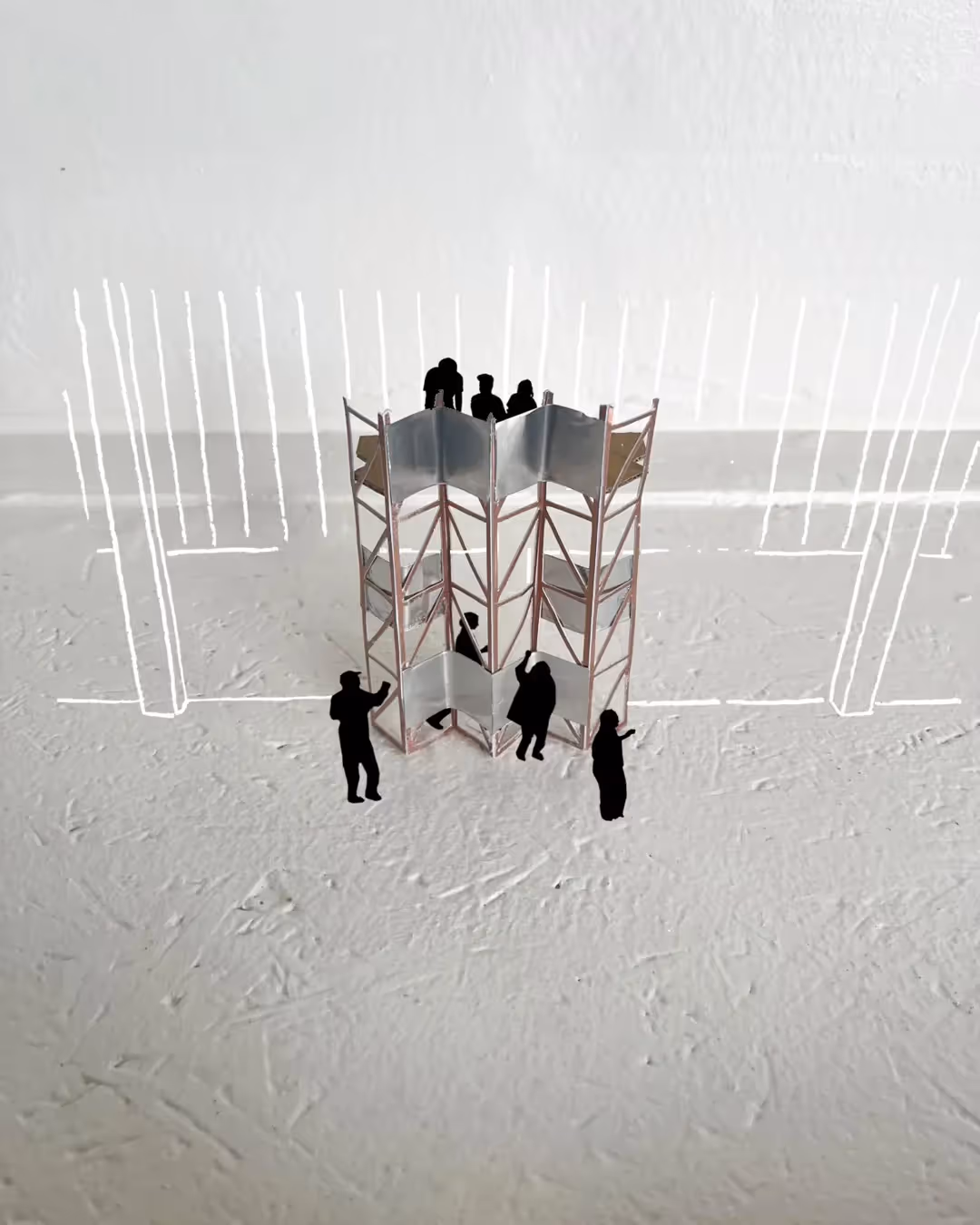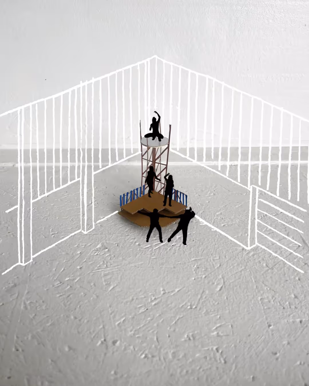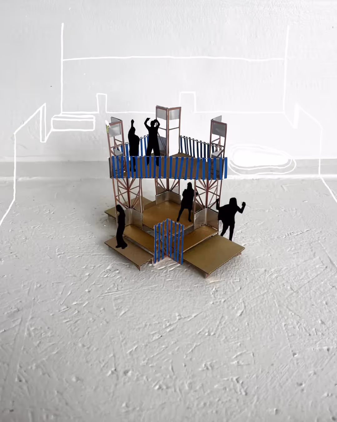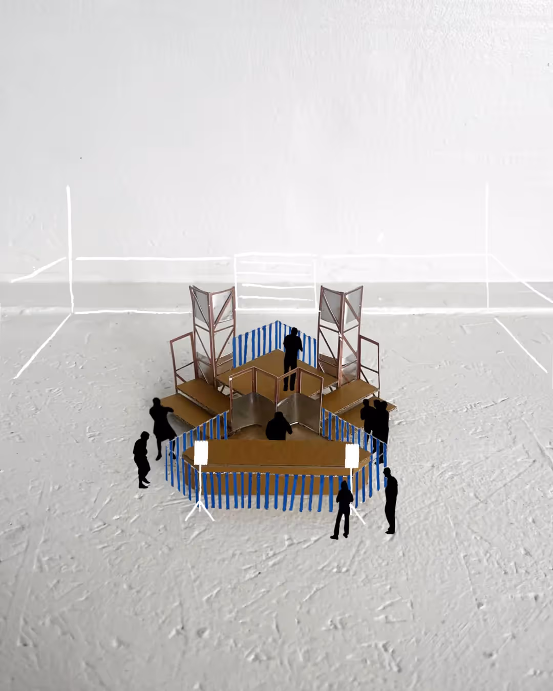 At the heart lies a compact central dance floor, framed by four monumental colored nets. They rotate and respond to intensity: enclosing dancers into an intimate cocoon, or opening outward to let the space expand. Around this core unfolds a topography of platforms and structures (think: stages, balconies, hidden corners) each inviting a different kind of movement. The room constantly reinvents its own scale in dialogue with rhythm, light, and energy.