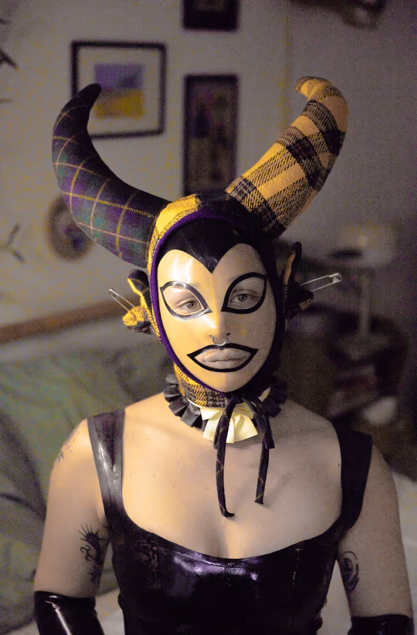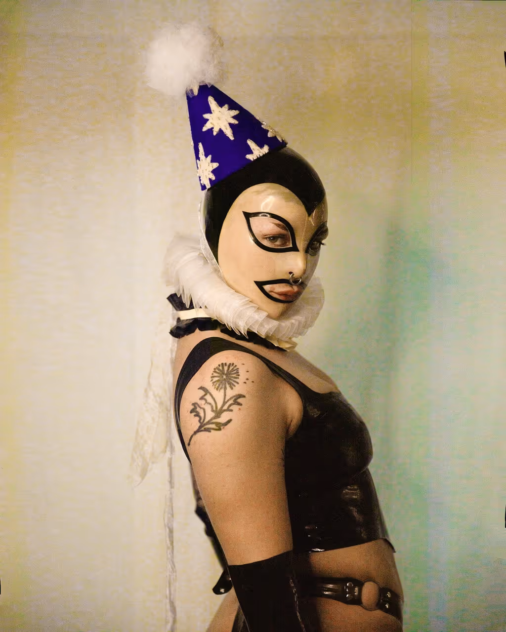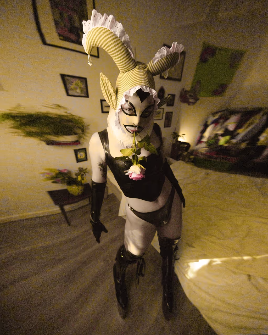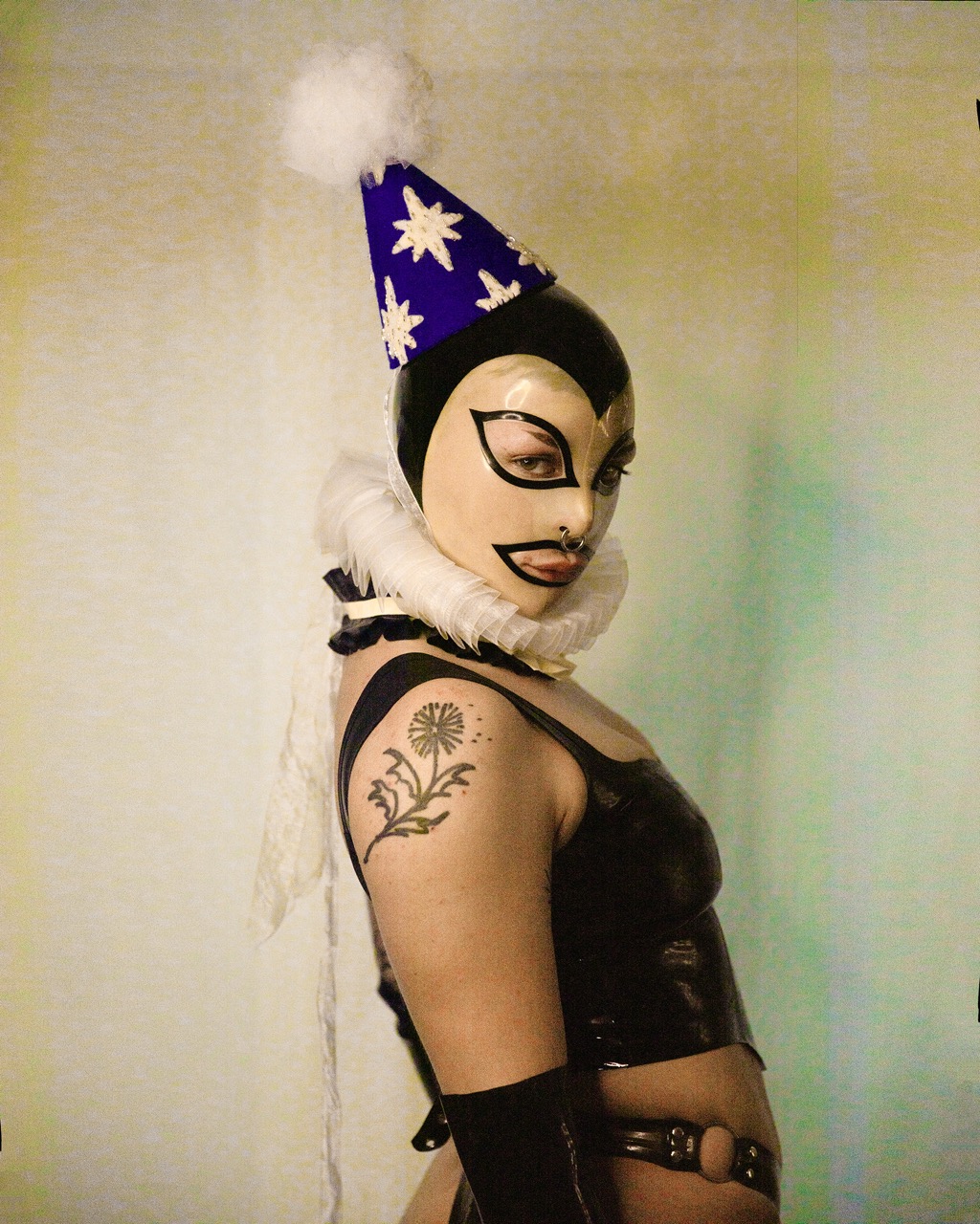 A drag queer blurring femininity and masculinity, he designs his outfits himself, sometime in collaboration, using only second hand materials he upcycles.