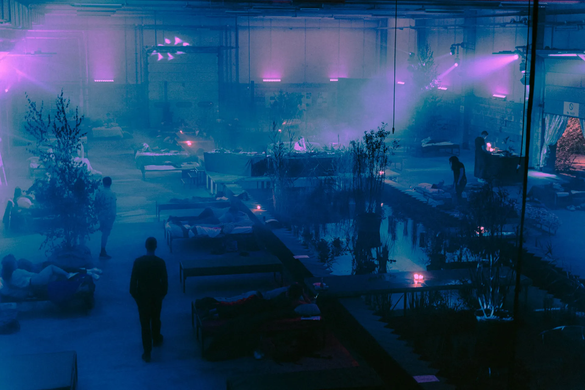 Flying on the raven’s wing was a cross-disciplinary exhibition appropriating Asiat in Vilvoorde as a site of new promises. The artistic interventions hovered between autonomous artworks, inventive dancefloors, collaborative commissions and circular architecture. We welcomed Aline Bouvy (BE), Daan Gielis (BE), Sonia Gomes (BR), Rashid Johnson (US), Rotor (BE), Tarek Lakhrissi (FR), Leopold Banchini (CH), Grace Ndiritu (UK/KE) and Marinella Senatore (IT) as participating artists and architects. Their contributions, mostly site-specific commissions, adorned and reinvigorated the crumbling architecture of Asiat. Their works spanned video, audiovisual interventions, sculpture and installation.