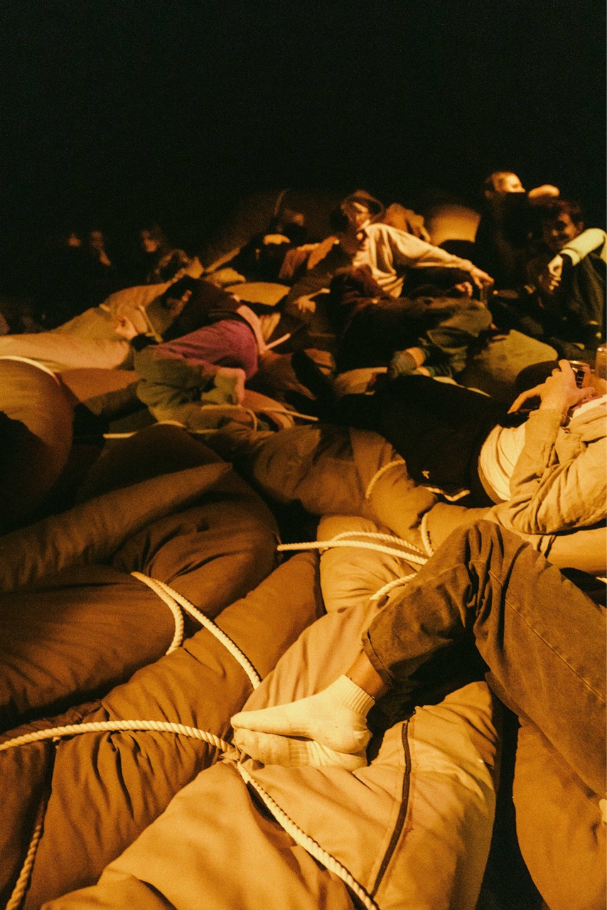 Alongside its care programme, Horst tries to infuse care into every aspect of its architecture and atmosphere. Textile artist and scenographer Isabel Brems describes how her sanctuary installation emerged from noticing “how roots grow everywhere, even between concrete,” a metaphor for resilience and grounding. She wanted “a place where people can relax, take a breather, and talk with friends,” adding softness and stillness to an environment that can be overwhelming. “It would be nice if spaces like this could exist anywhere in the world, places to calm down and reflect on what is going on in yourself and around you.”