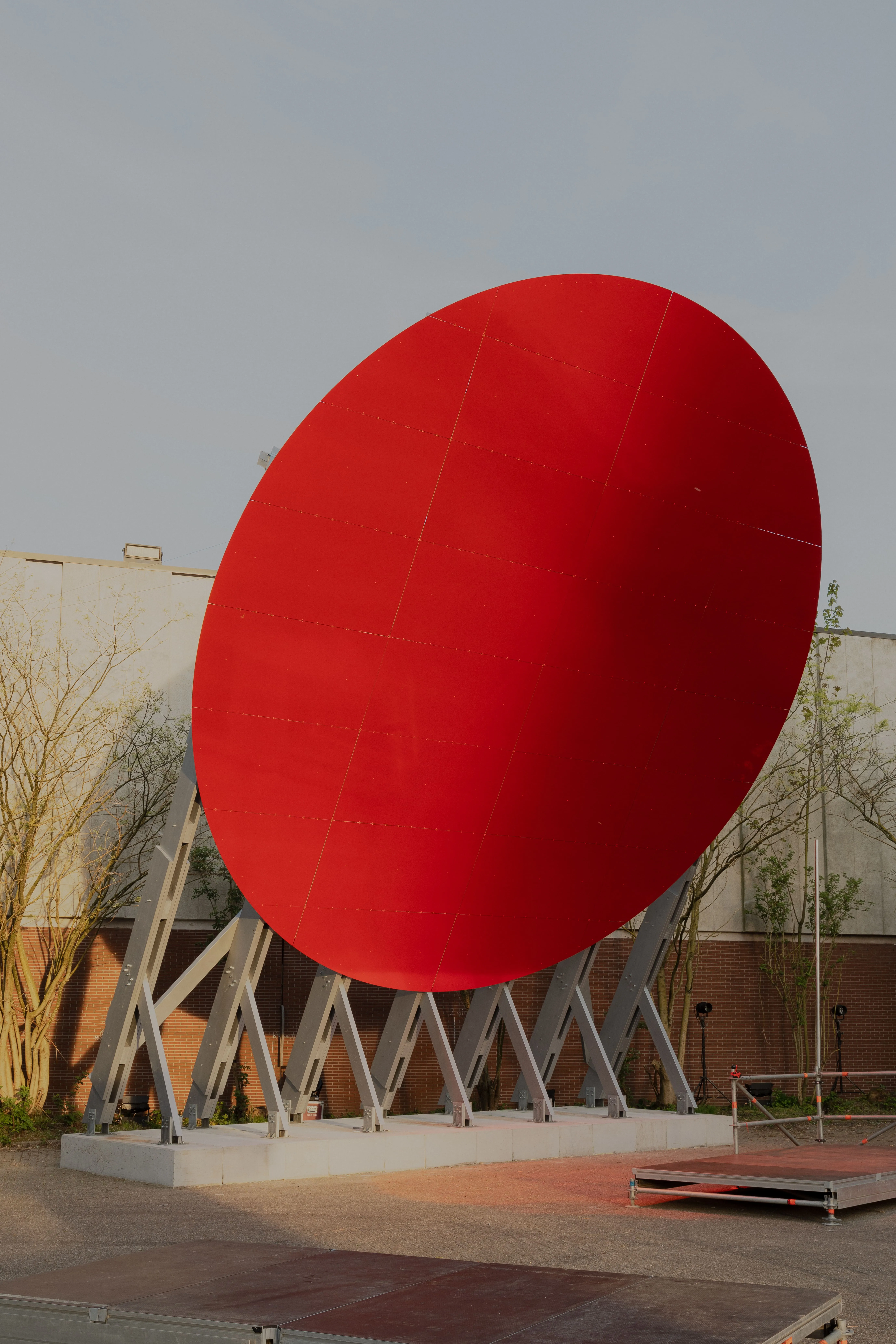 Le Soleil Rouge is a performance device that alters space and light. Aligned towards the sunset and the two imposing cooling towers, this new established scenario – or environment – catalyses a new social interaction sculpted by nature, music and the dancers. Framed by these towers, individuals become part of a collective orbiting the Le Soleil Rouge. The extreme simplicity of the wooden structure – referencing a billboard – magnifies in contrast with the odd splendour of the mirrored disc, measuring 10m in diameter.
