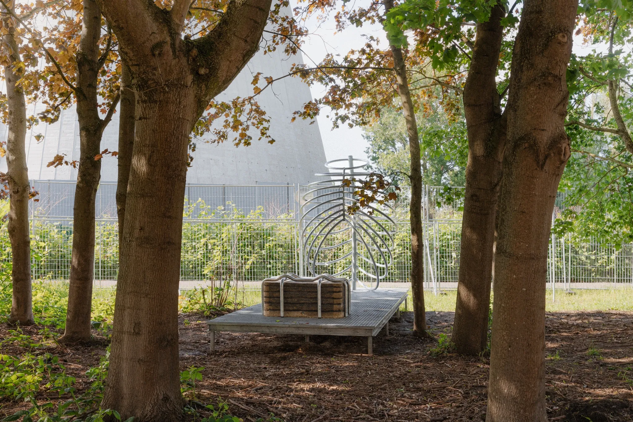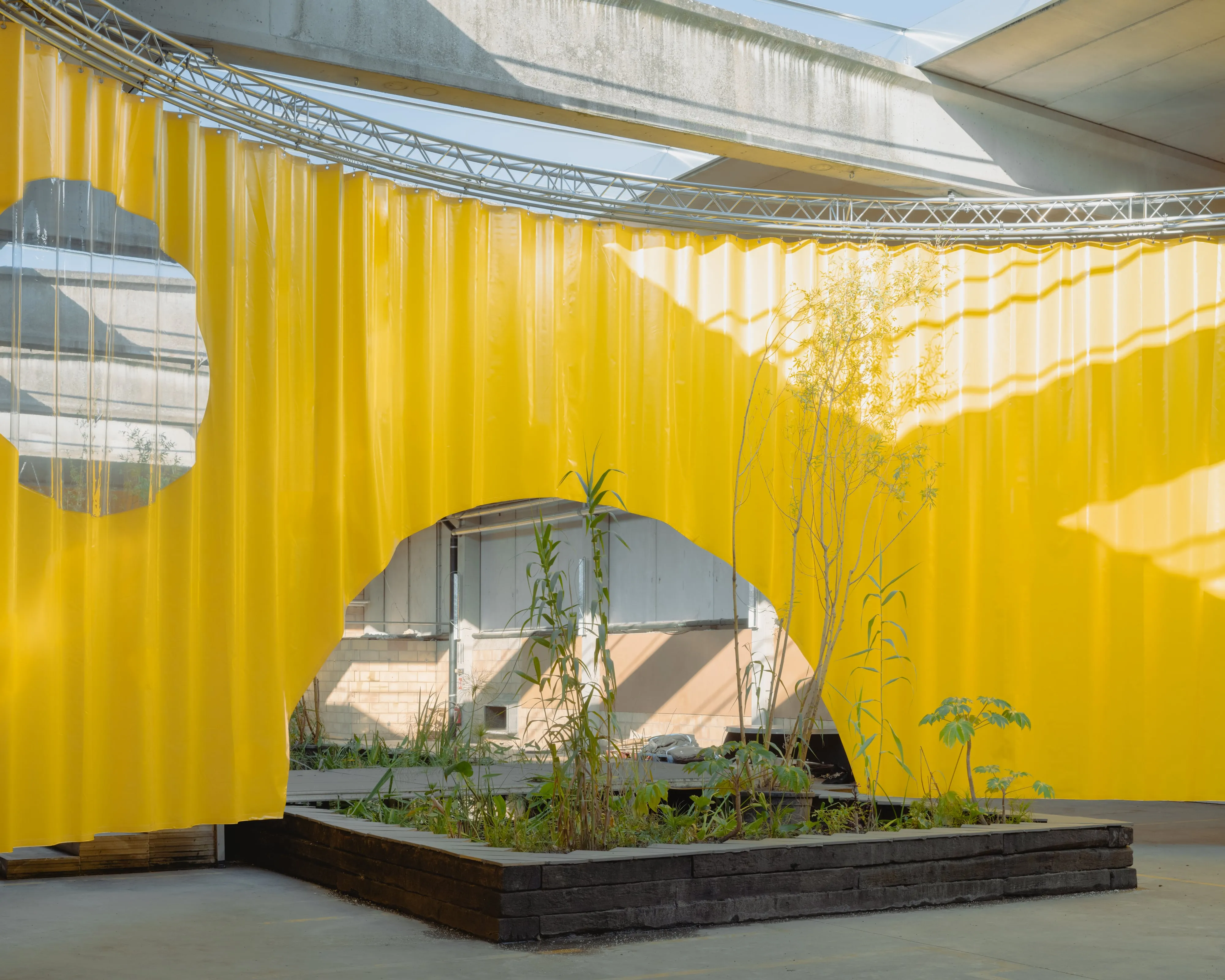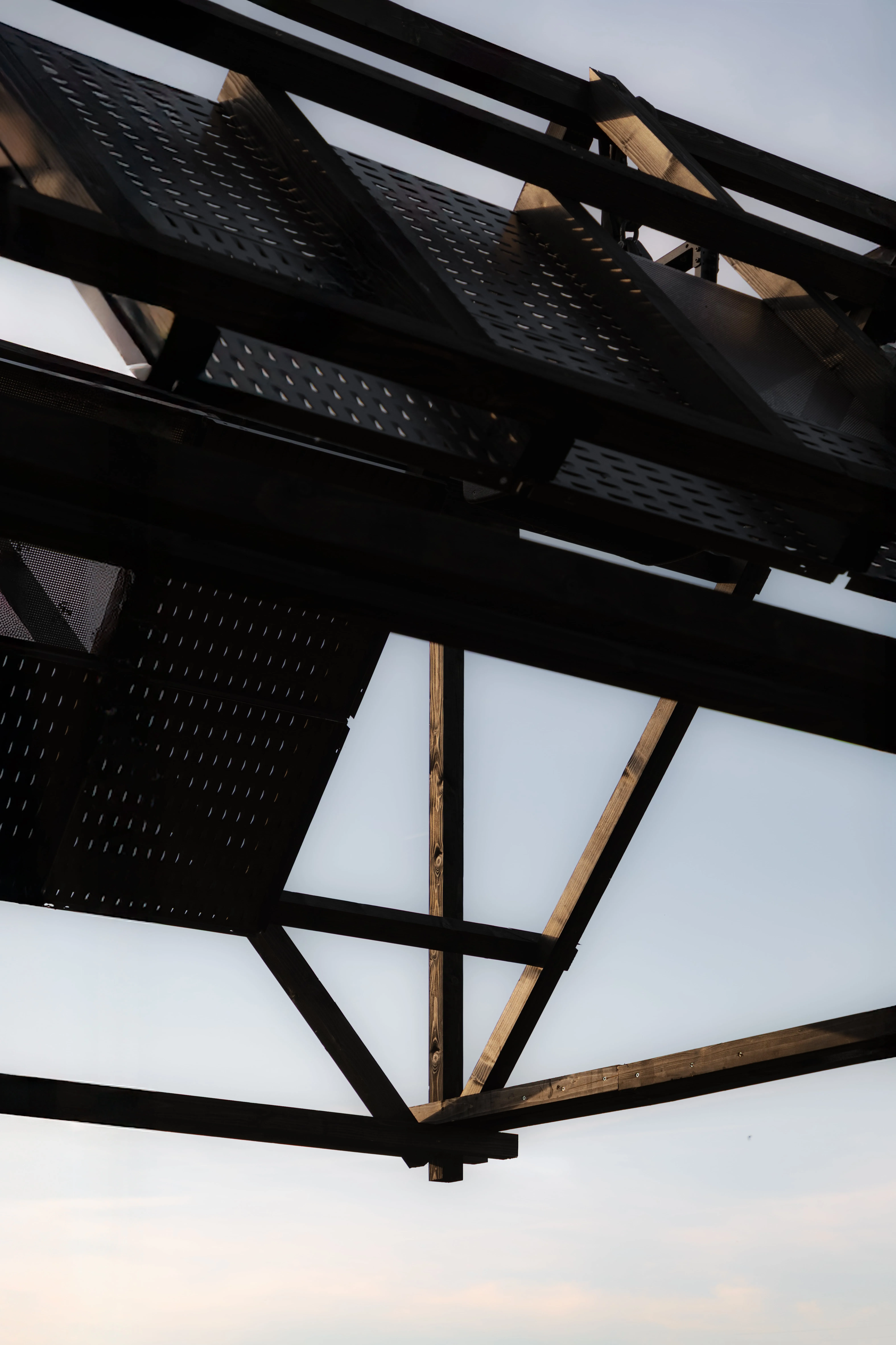 Black impregnated wood, reclaimed ceiling panels from the renovation of Asiat Park, corrugated metal sheets, steel column bases and prefabricated concrete slabs.
