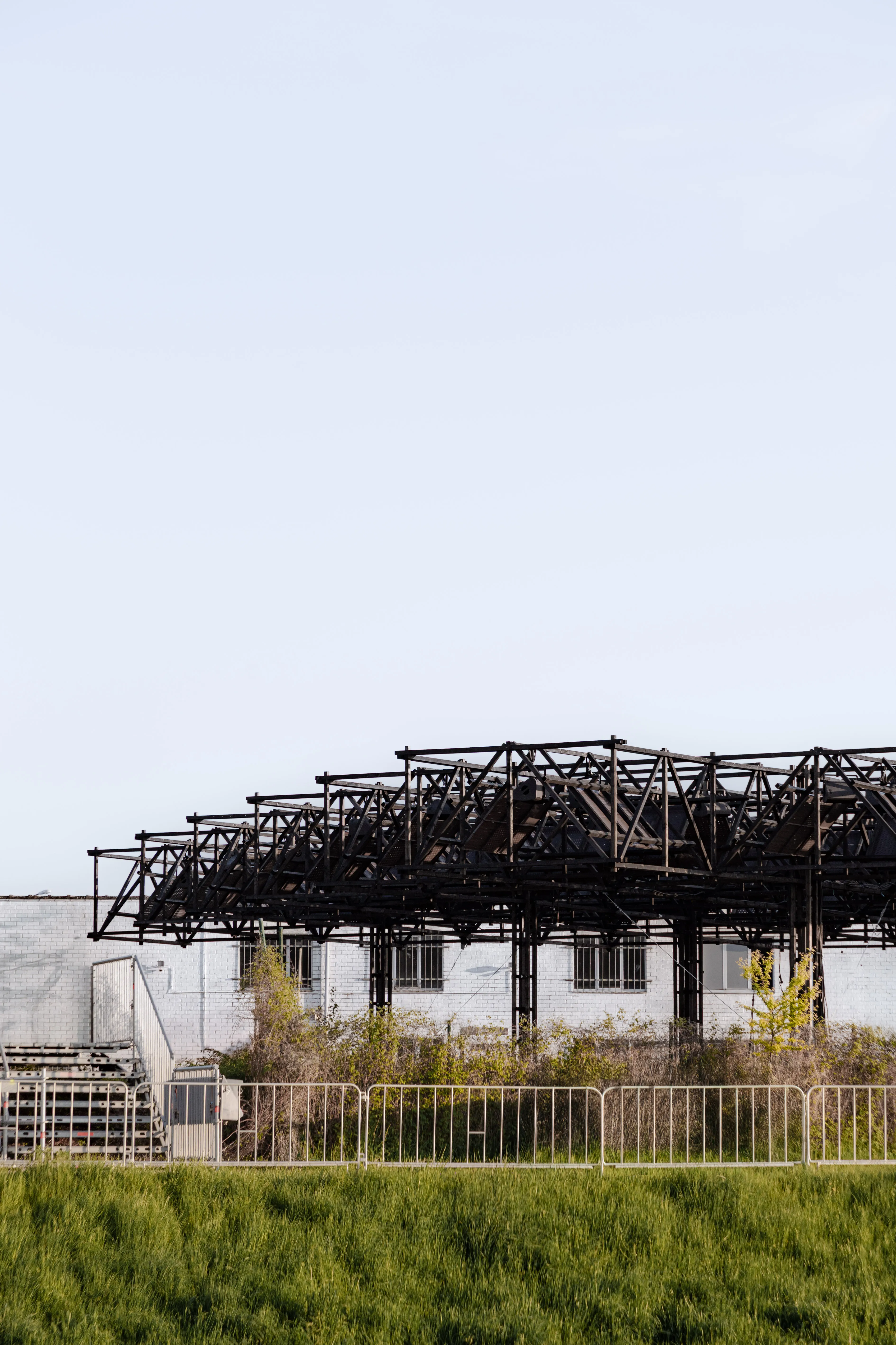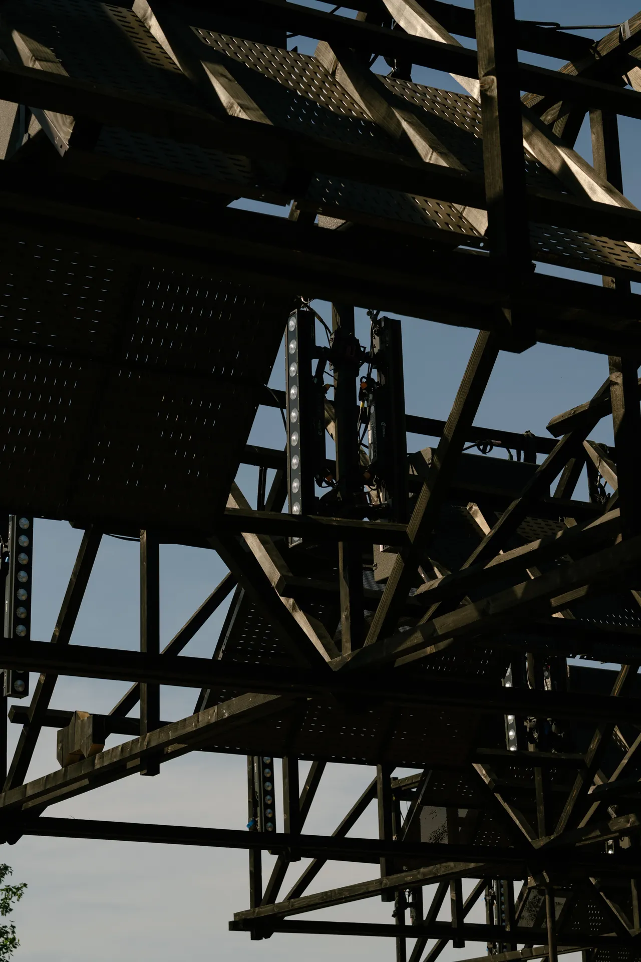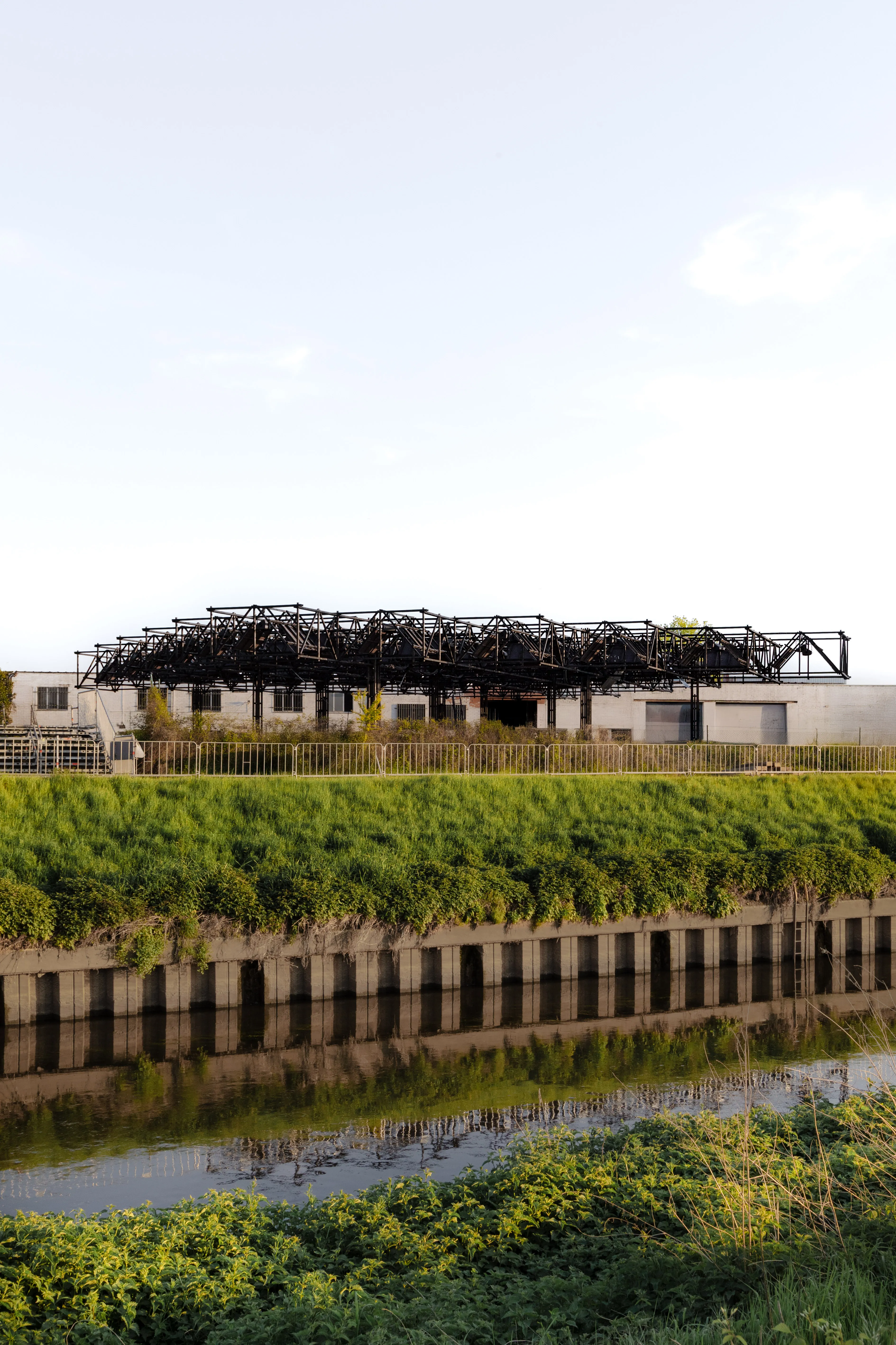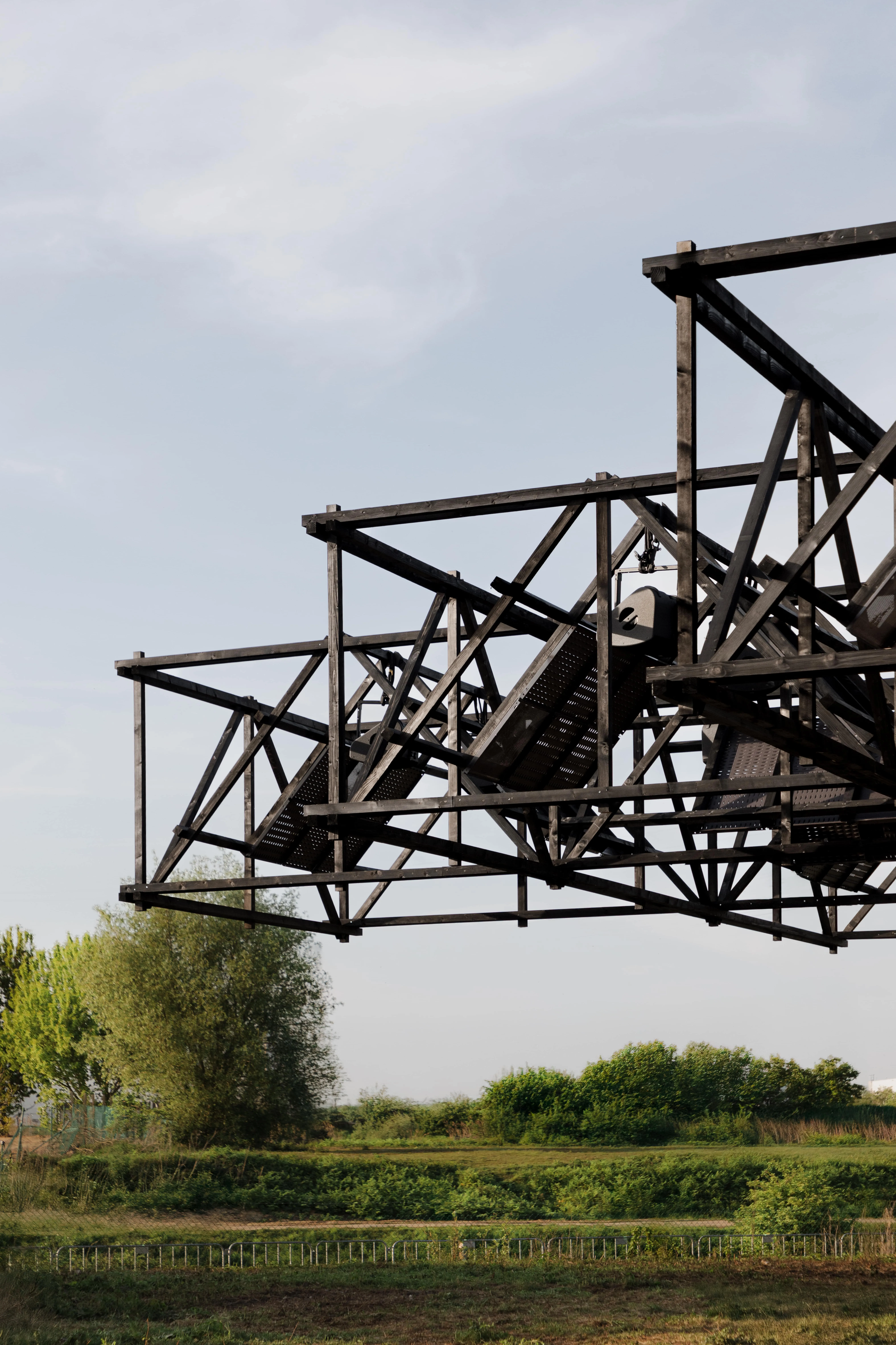 Black impregnated wood, reclaimed ceiling panels from the renovation of Asiat Park, corrugated metal sheets, steel column bases and prefabricated concrete slabs.