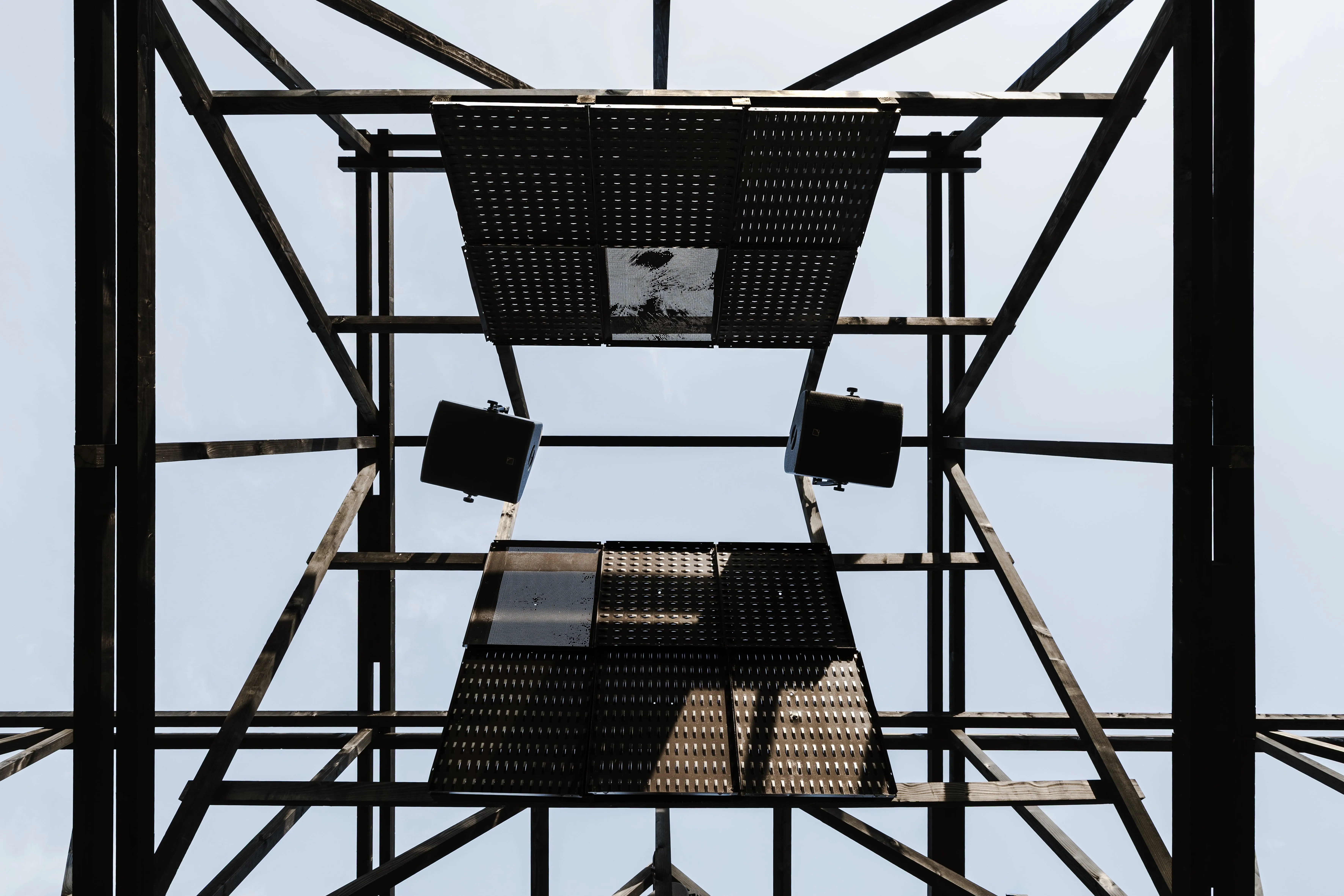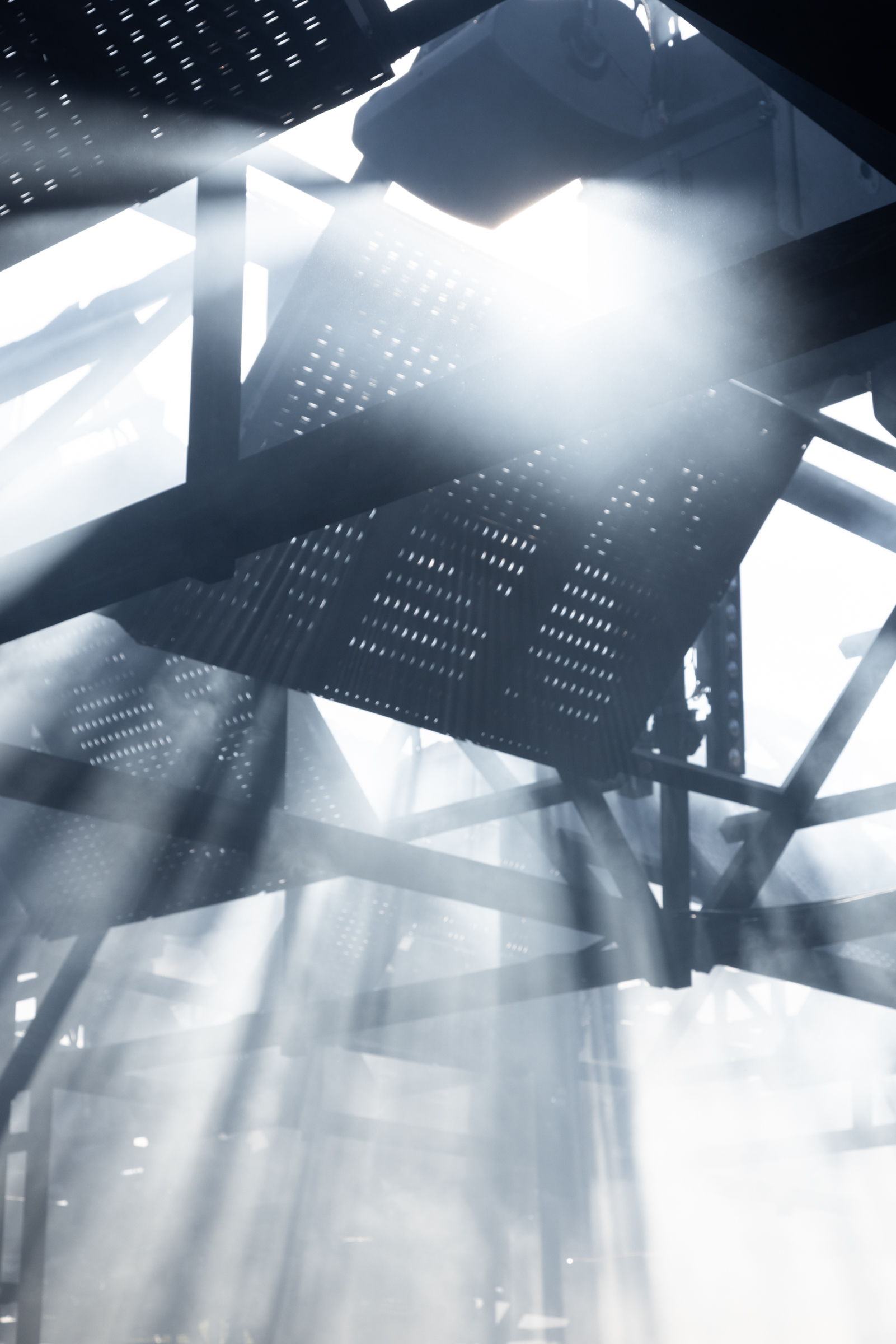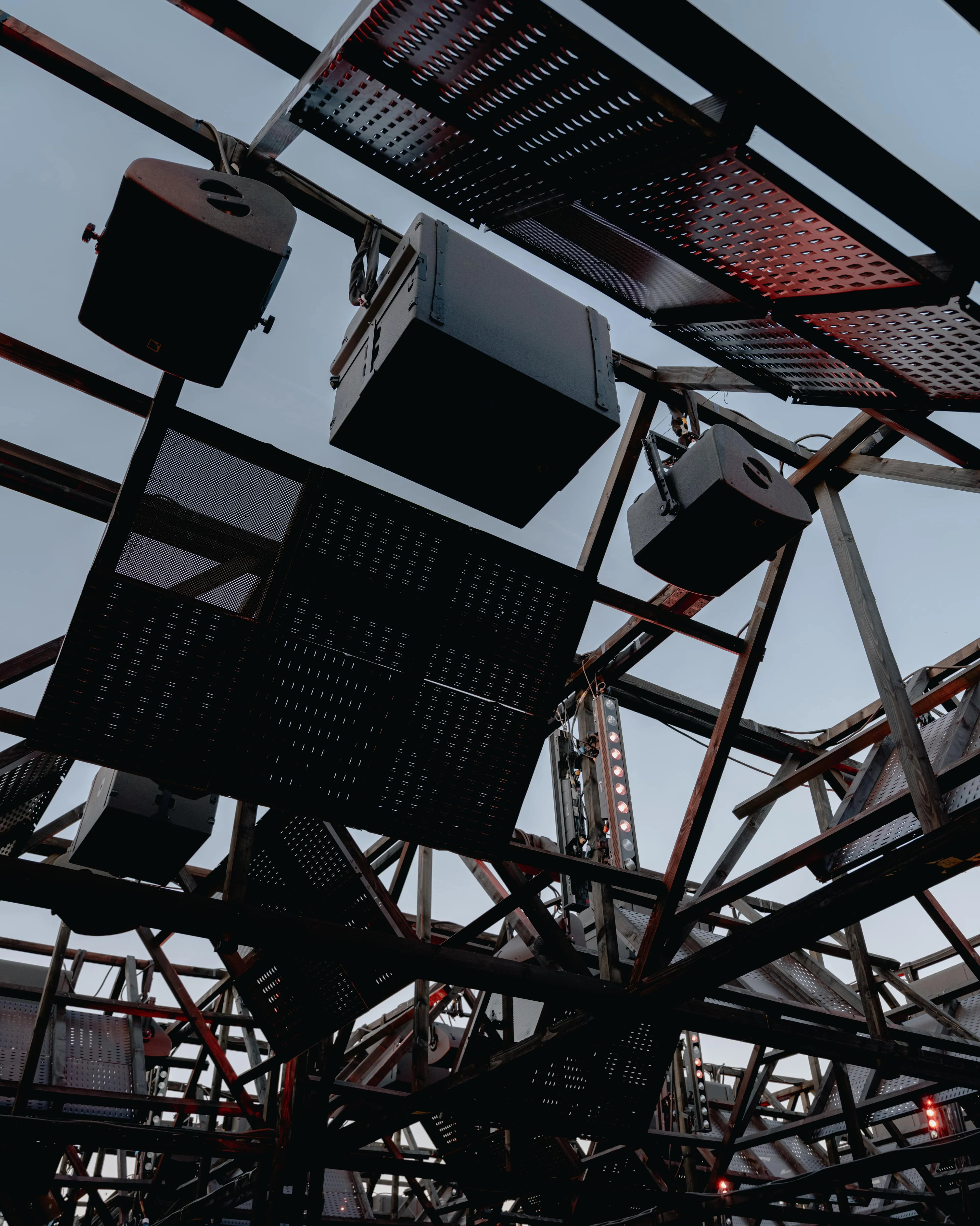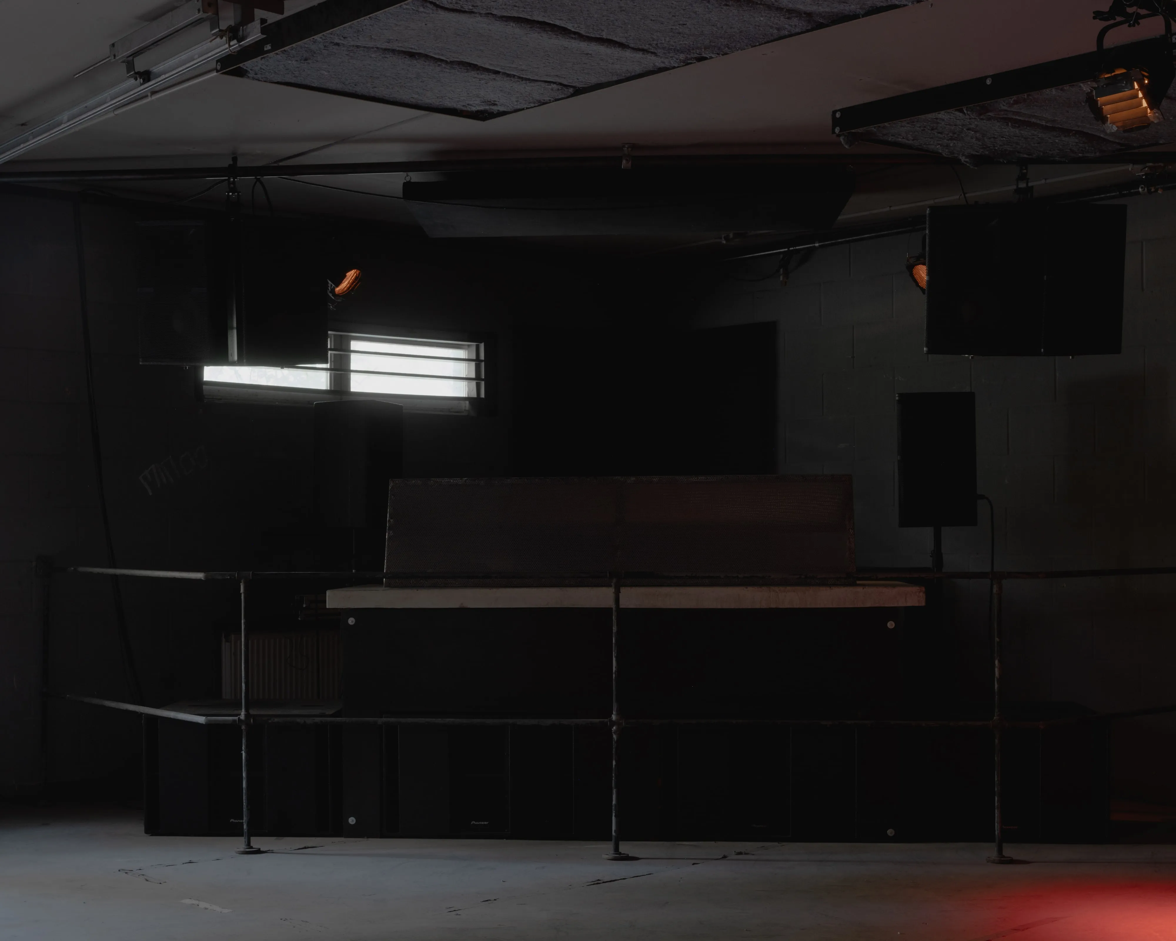 Entirely suspended above the crowd, the roof of speakers creates a close and intimate relation between the membranes and the ears, removing the attention from the performer. A democratic and multidirectional dancefloor, no one is further than a couple meters from the sound source and everyone is in the forefront.