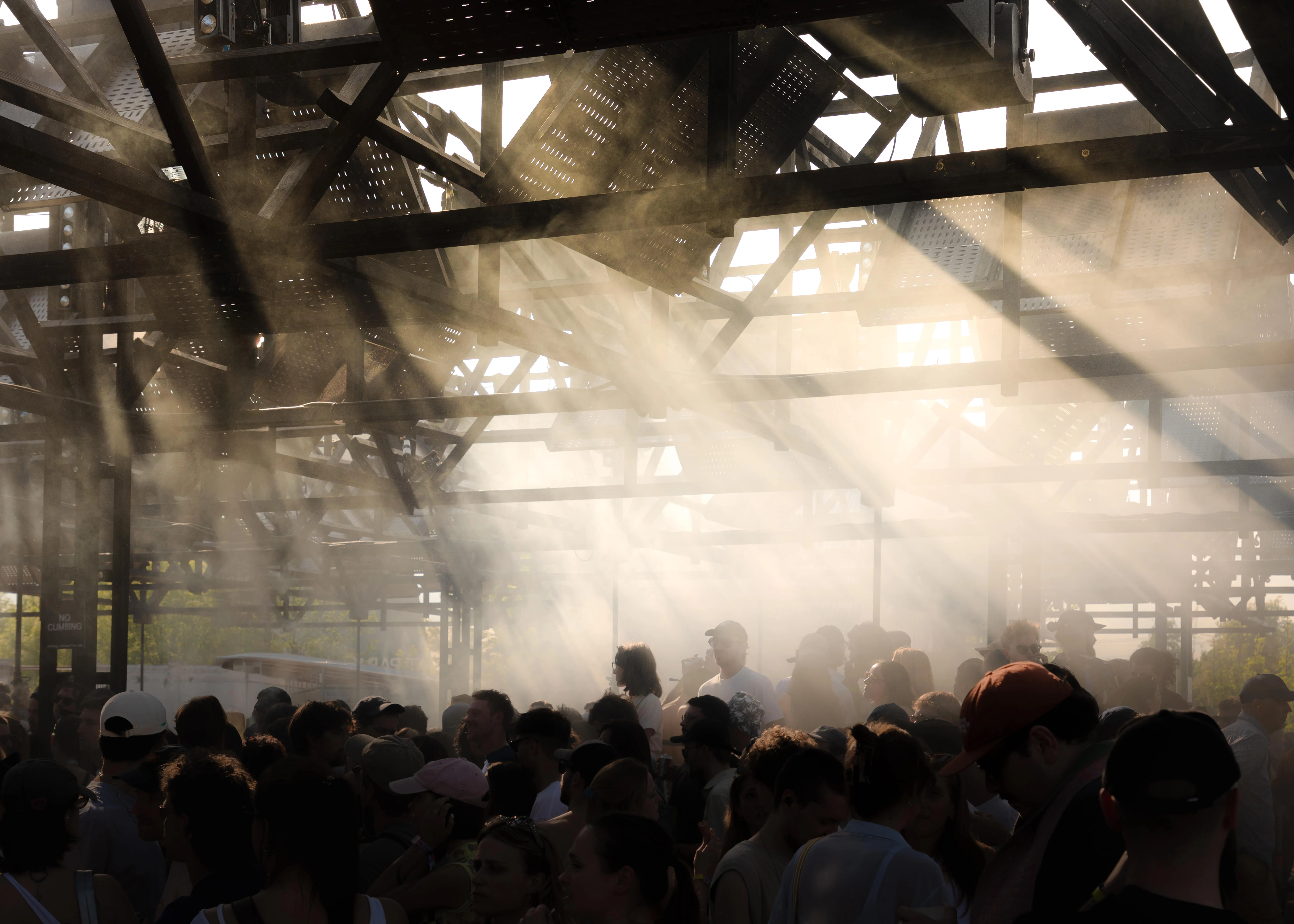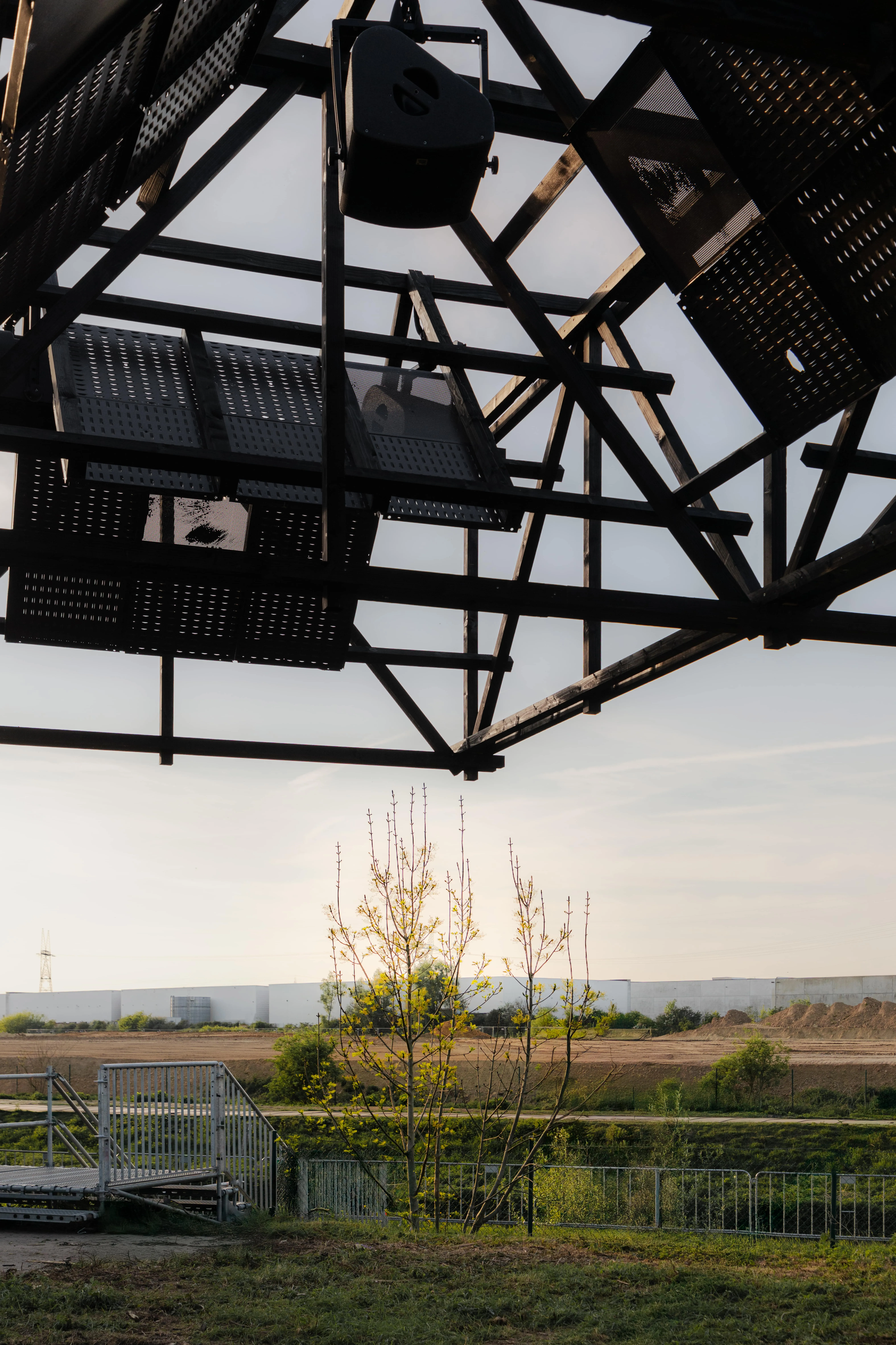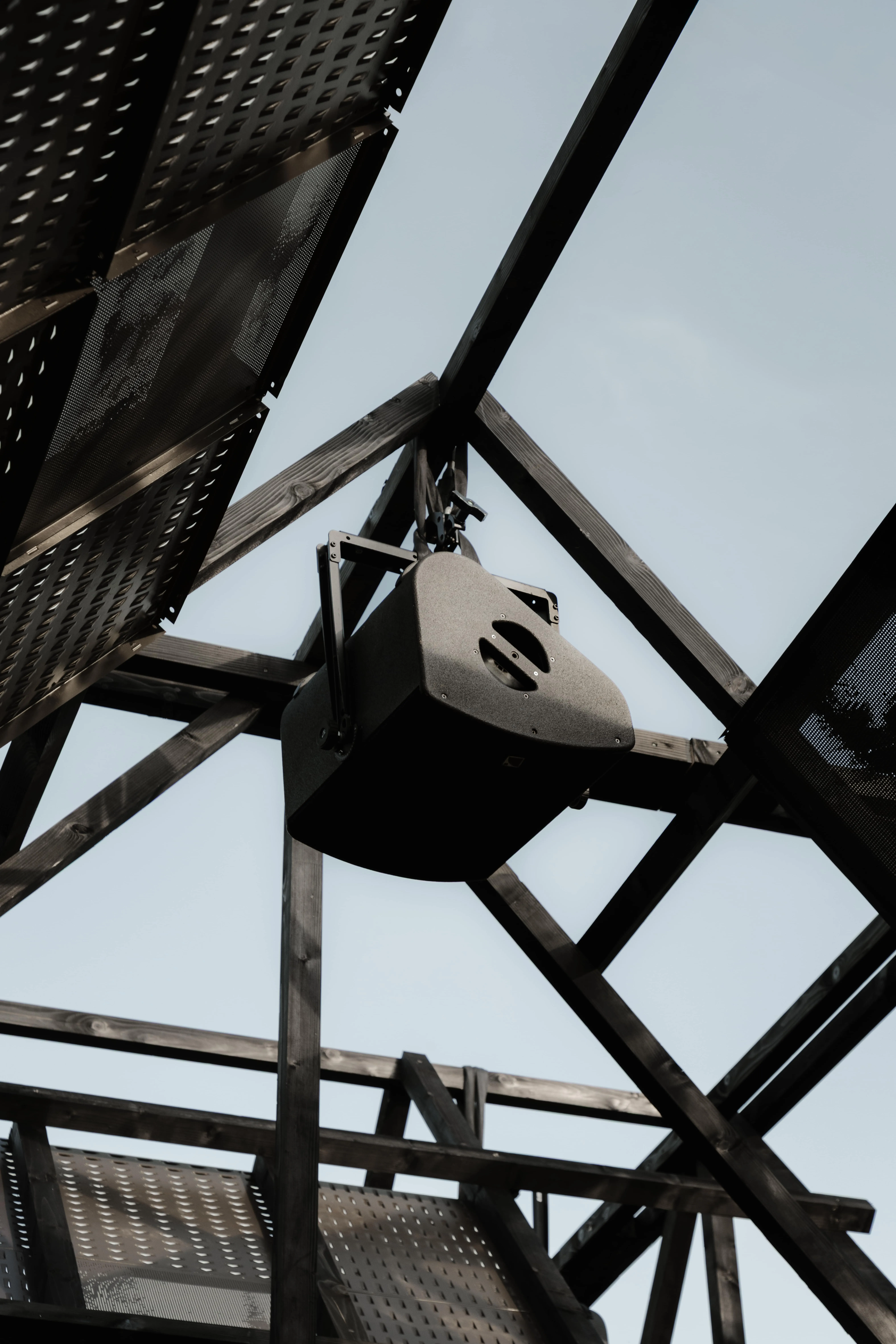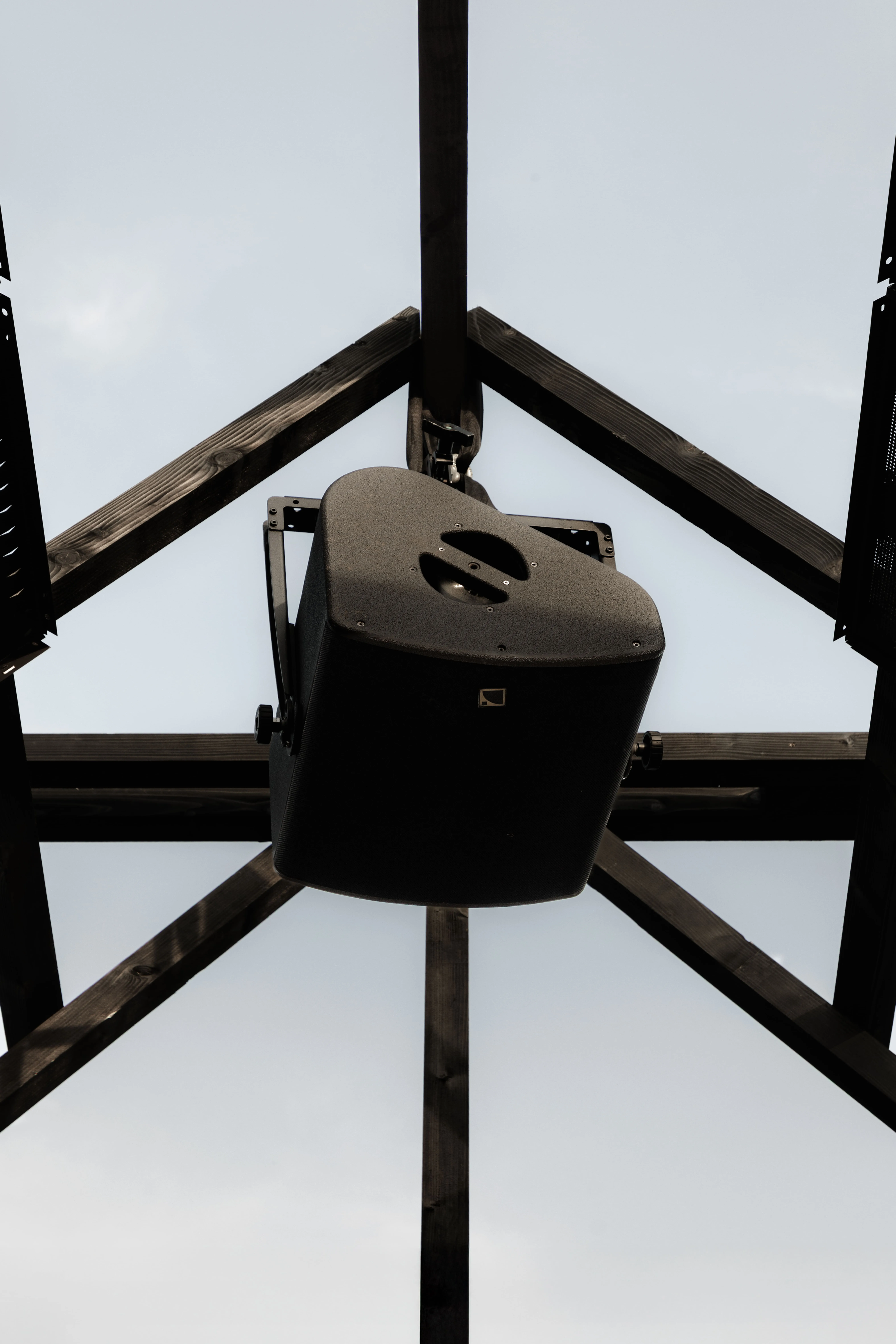 Le toit des haut-parleurs est complètement suspendu au-dessus de la foule, créant une relation étroite et intime entre les membranes qui captent les vibrations et les oreilles. L'attention se détourne de l'artiste pour se concentrer sur l'expérience d'écoute partagée.