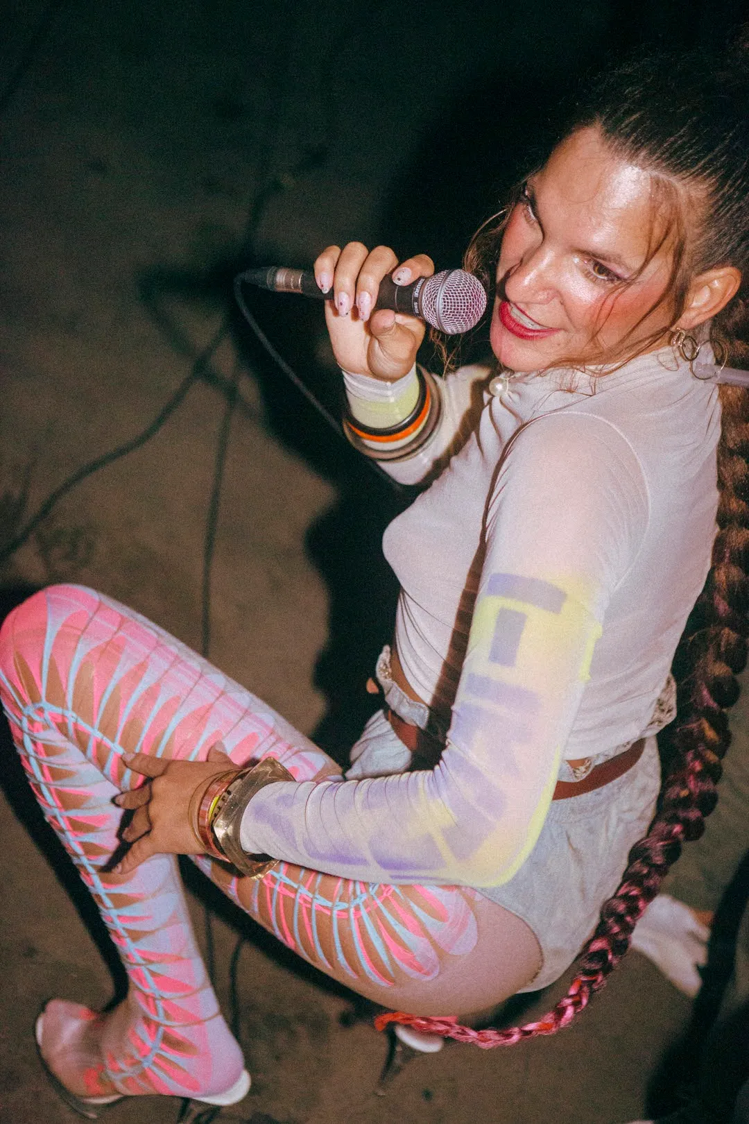 The exploration of transformation and the interplay among space, time, and crowds are at the core of her practice. She invites us to get a glimpse of her world by “acting as a catalyst alongside people and the environment, mutually influencing each other, and weaving narratives as we party”.