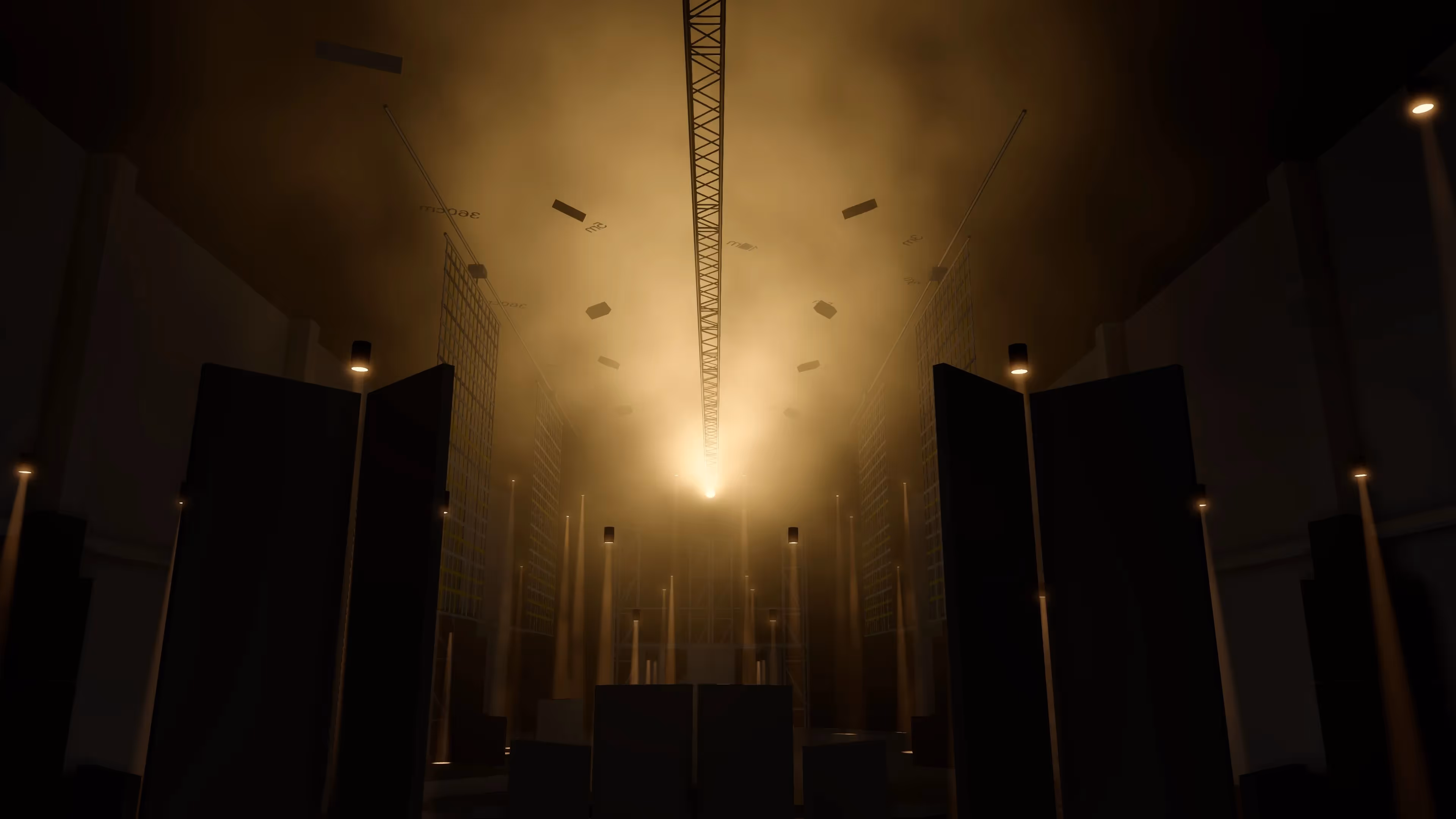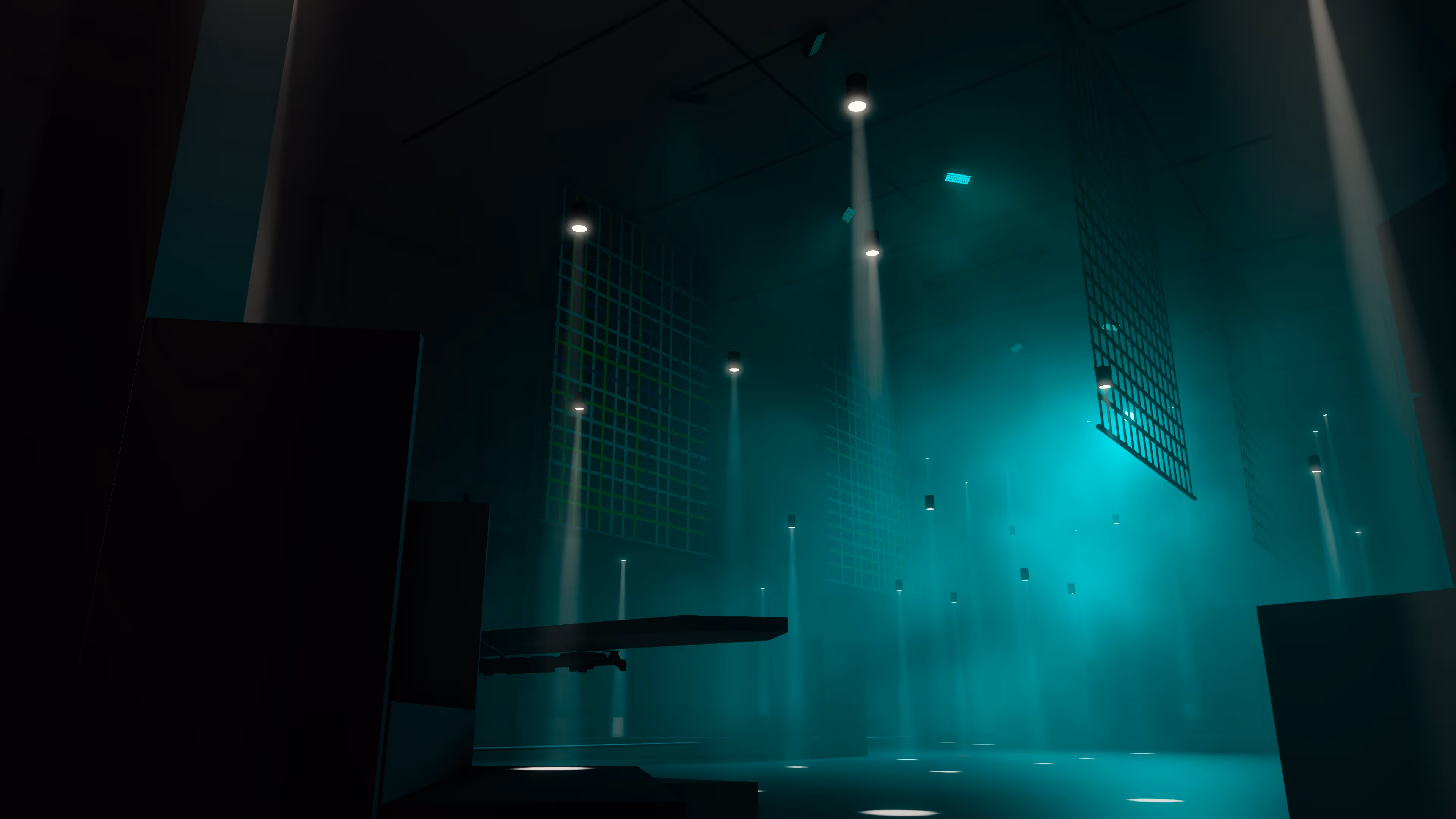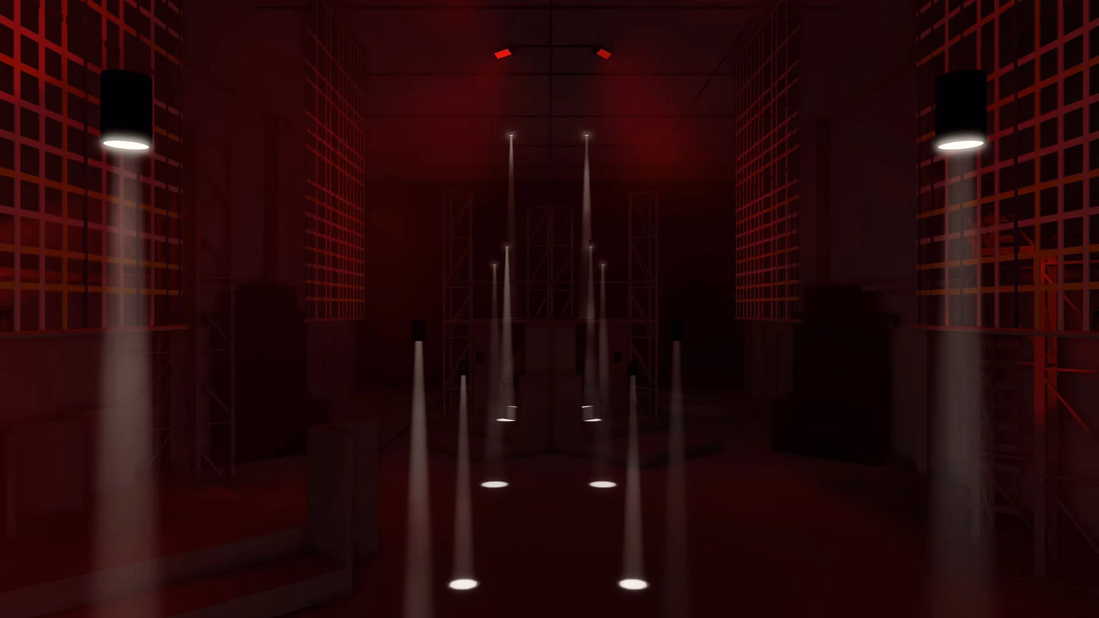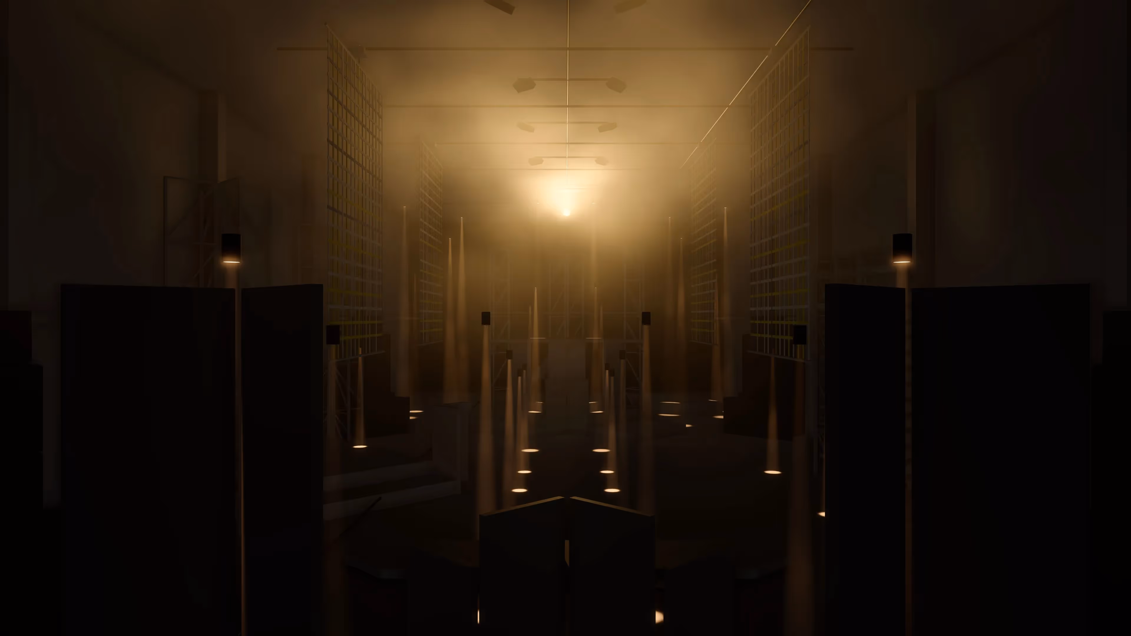 One large source of light travels through the space marking the passage of time like the sun across the celestial sphere. A cluster of smaller lights occupies the sky forming a 3D topography, a contour of the structures below. Powerful wash lights hold the ground, eruptions of coloured light emerge from within the structures that surround us.